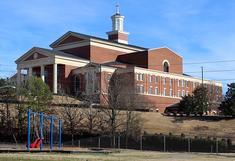 The playground at Terry Elementary School, located at 10800 Mara Lynn Rd. in Little Rock, is seen in the foreground while Immanuel Baptist Church, located at 501 N. Shackleford Rd., is visible in the background on Tuesday, Dec. 19, 2023. (Arkansas Democrat-Gazette/Kyle McDaniel)
