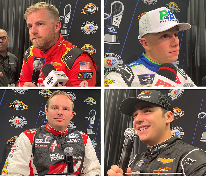 Justin Allgaier (clockwise, from top left), John Hunter Nemechek, Sam Mayer and Cole Custer talk to the media at Phoenix Raceway during Media Day on Nov. 2. (Arkansas Democrat-Gazette/Jared Haas)